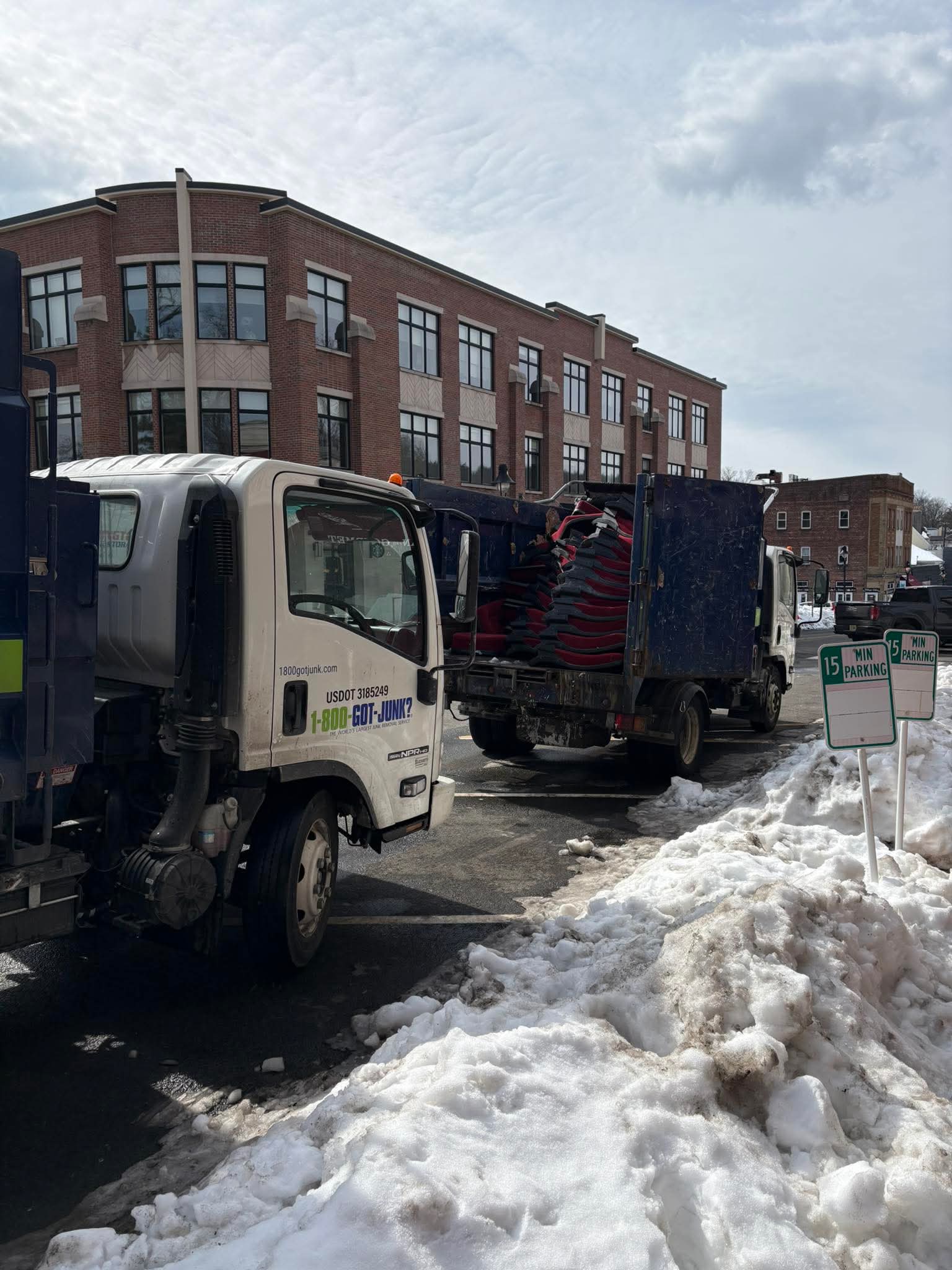 Old auditorium seats being hauled away from the Maplewood Theater on February 26, 2026. (Photo by Kari Capone)