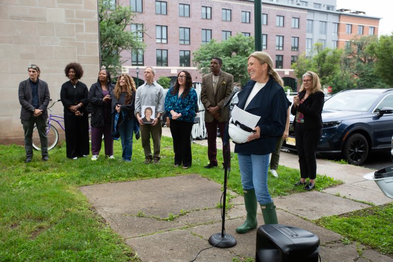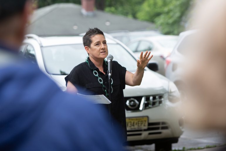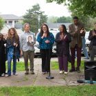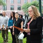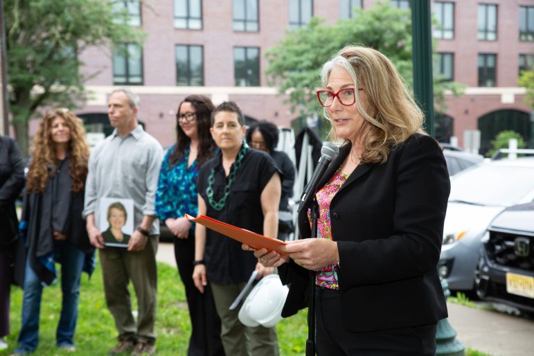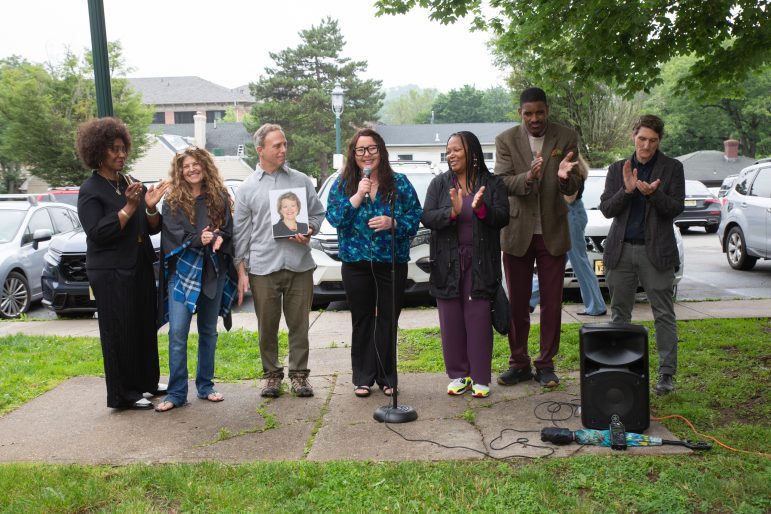 South Orange Council member Steve Schnall carries a photo of Karen Hilton who could not be present for the groundbreaking.