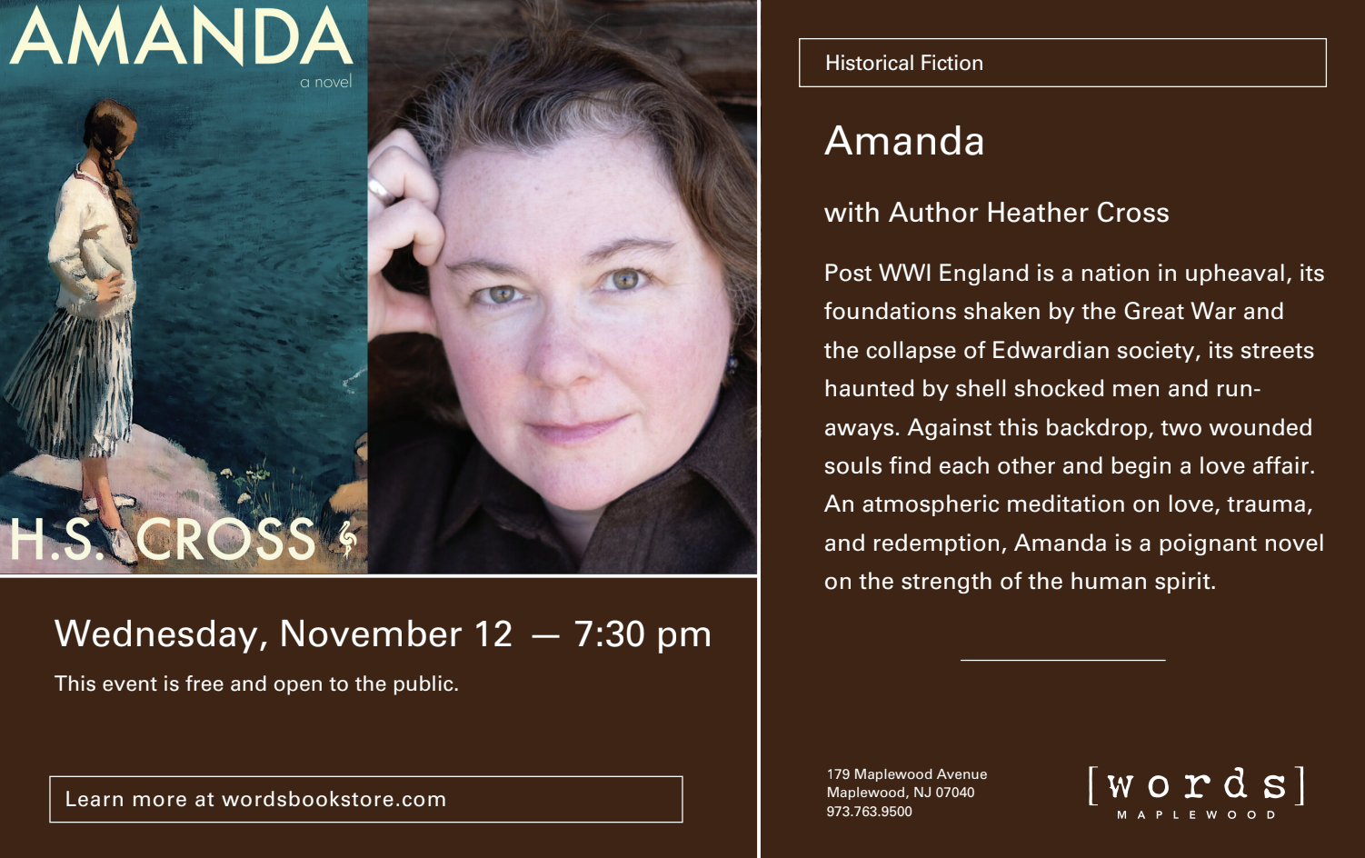 Please join us at Words Bookstore in Maplewood on Wednesday, November 12th, at 7:30pm, where H.S. Cross will be reading from her acclaimed novel AMANDA and chatting about writing, inspiration, and all things literary. It’s going to be a fun, lively night and you don’t have to have read the book to come!