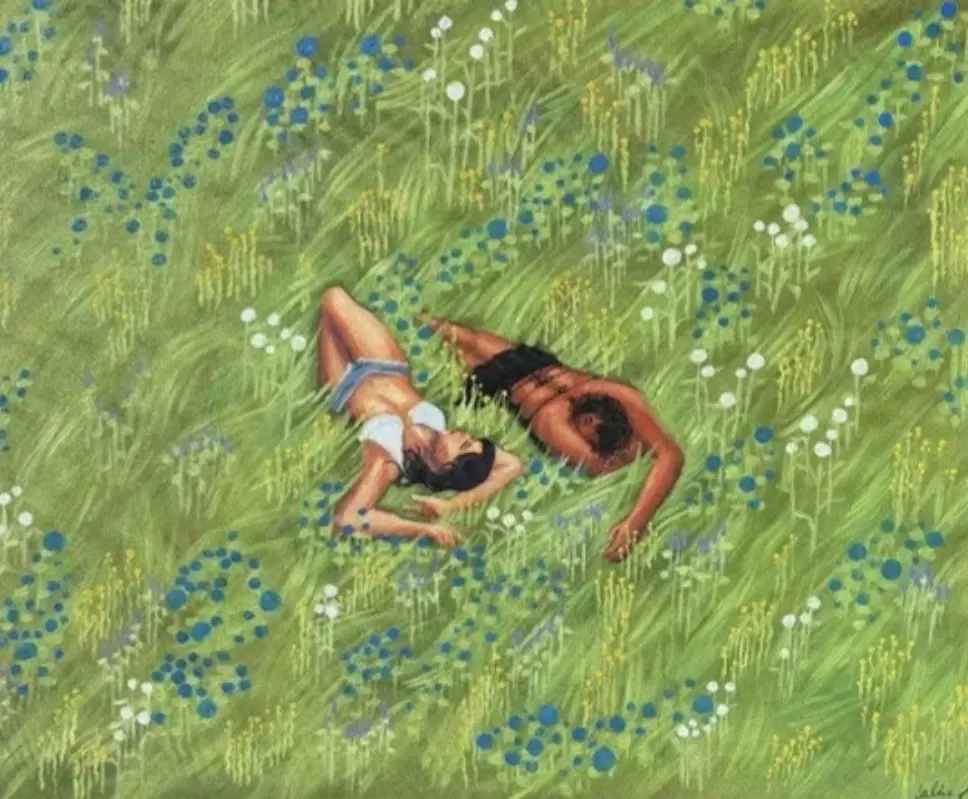 Caroline Shaw’s oil and embroidery painting on canvas titled, “We Share a Moment in the Meadow.”