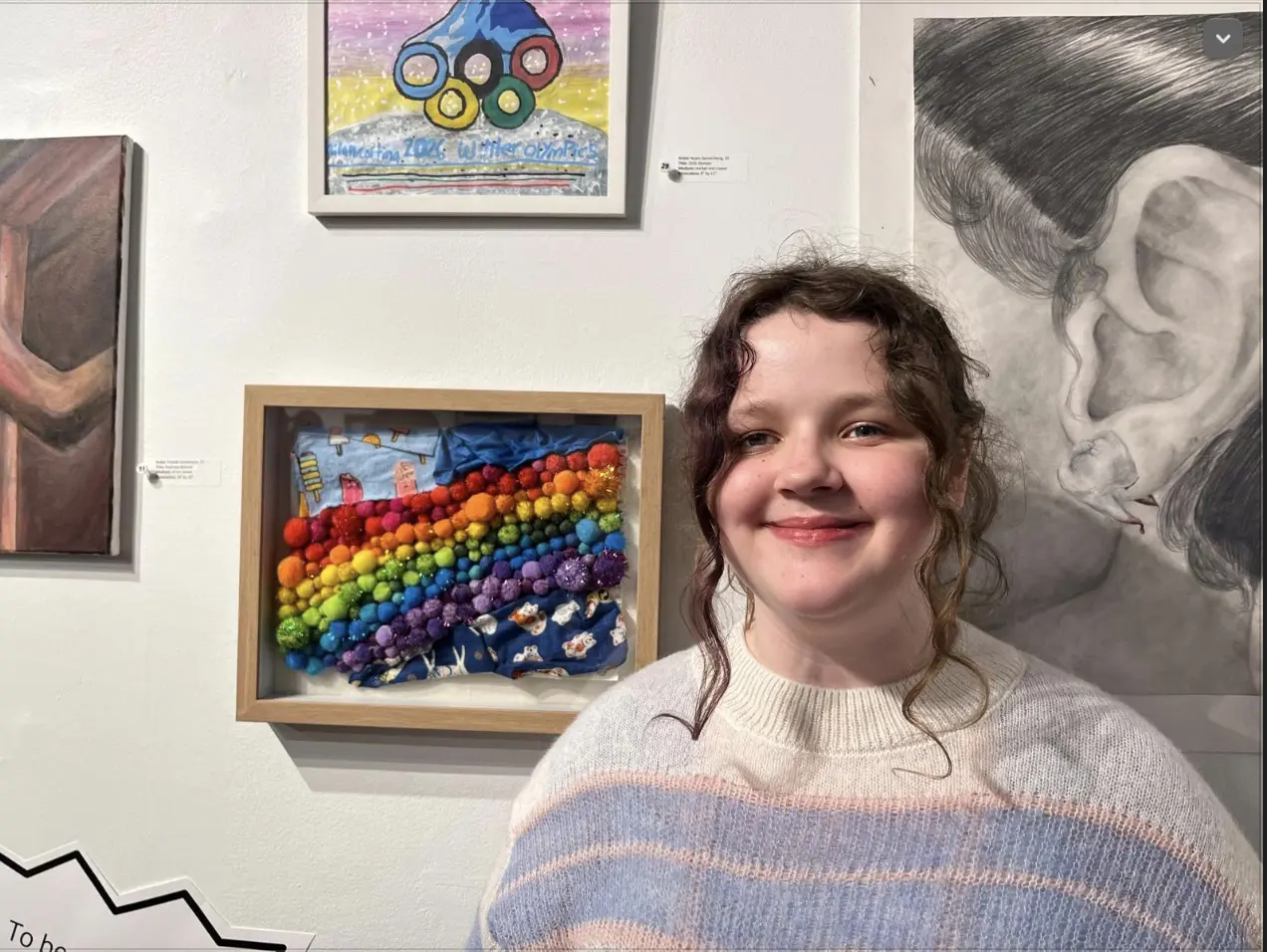 Aine Cope, a 5th grader at Seth Boyden, in front of her colorful mixed media art.
