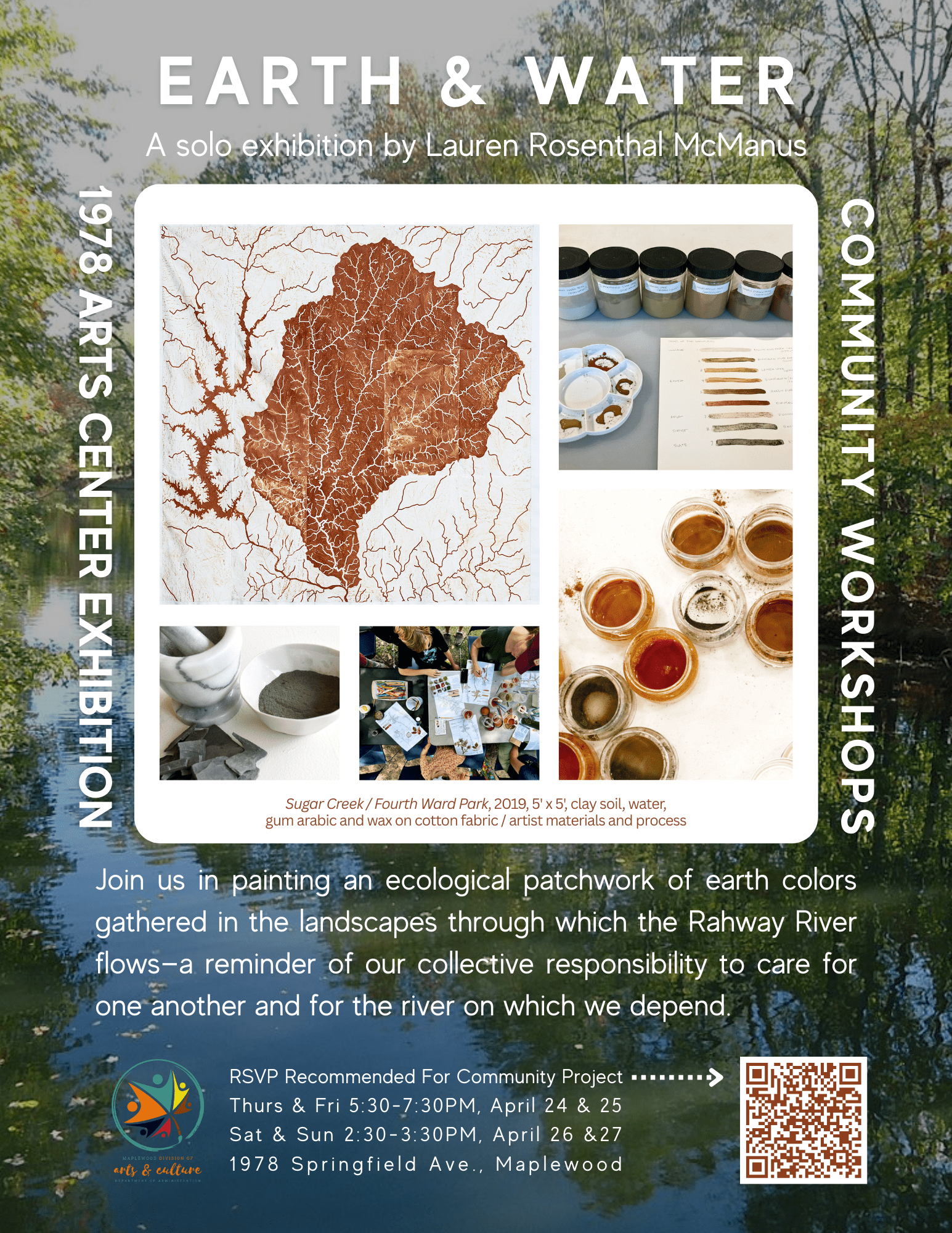 McManus’s exhibit, which coincides with national Earth Day (April 22nd), is inspired by elements of the earth, including the Rahway River Watershed, where 1978 Maplewood Arts Center is located. Her drawings, installations, and community-based projects combine geospatial data and site-specific pigments to emphasize the innate beauty and universal importance of freshwater systems; inspiring a deepened sense of place through the reconsideration of community boundaries and notions of home.