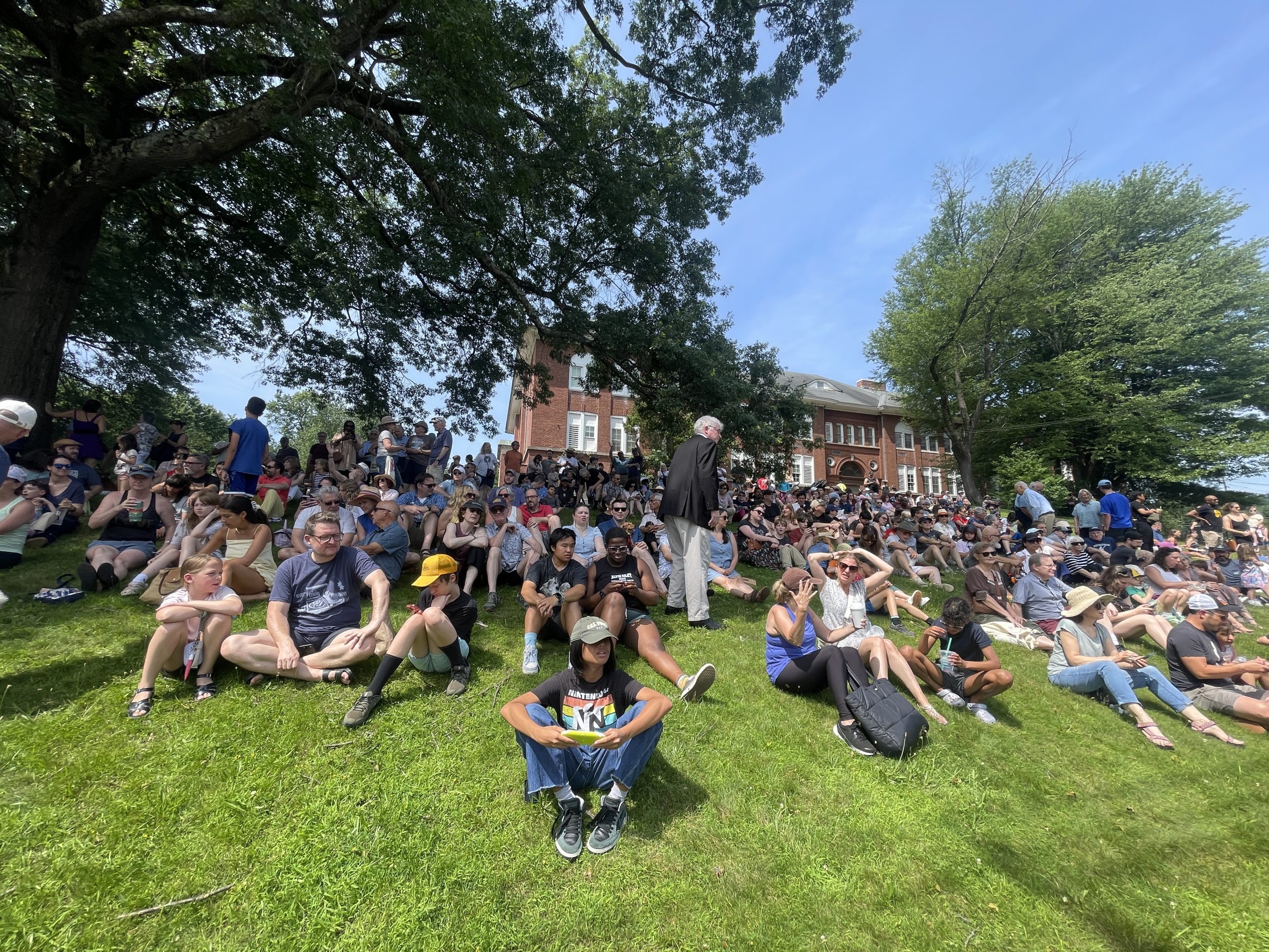 Crowds gather on grounds of Maplewood Middle School, across the street from Maplewood Memorial Library. Photo by Mary Barr Mann.
