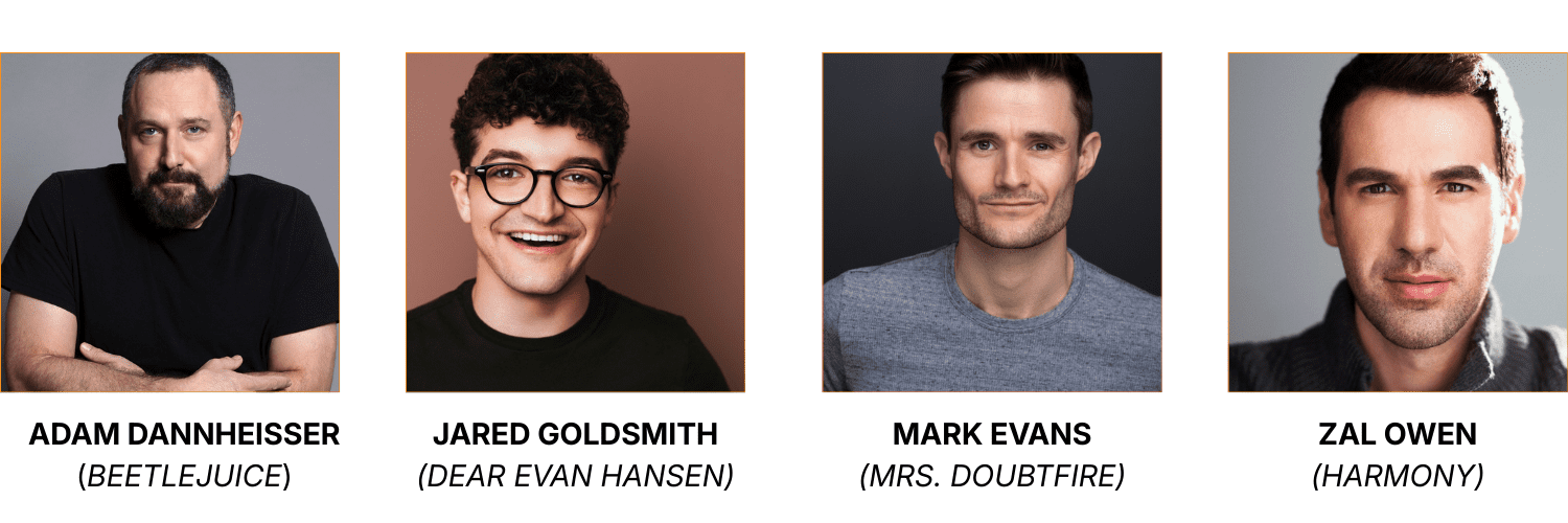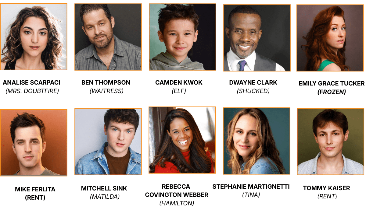 This year’s casts feature a number of acclaimed Broadway performers, including Adam Dannheisser (Beetlejuice), Mark Evans (Mrs. Doubtfire), Jared Goldsmith (Dear Evan Hansen), Zal Owen (Harmony), Analise Scarpaci (Mrs. Doubtfire), Ben Thompson (Waitress), Dwayne Clark (Shucked), Stephanie Martignetti (Tina), Rebecca Covington Webber (Hamilton) and more.