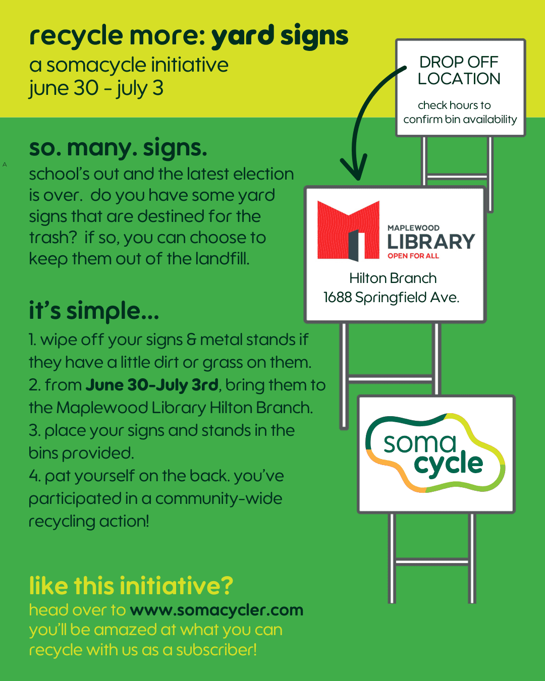 Redd seeks any “yard signs that are destined for the trash” and will be collecting them in bins at the Maplewood Hilton Branch Library, 1688 Springfield Avenue, from June 30 to July 3.