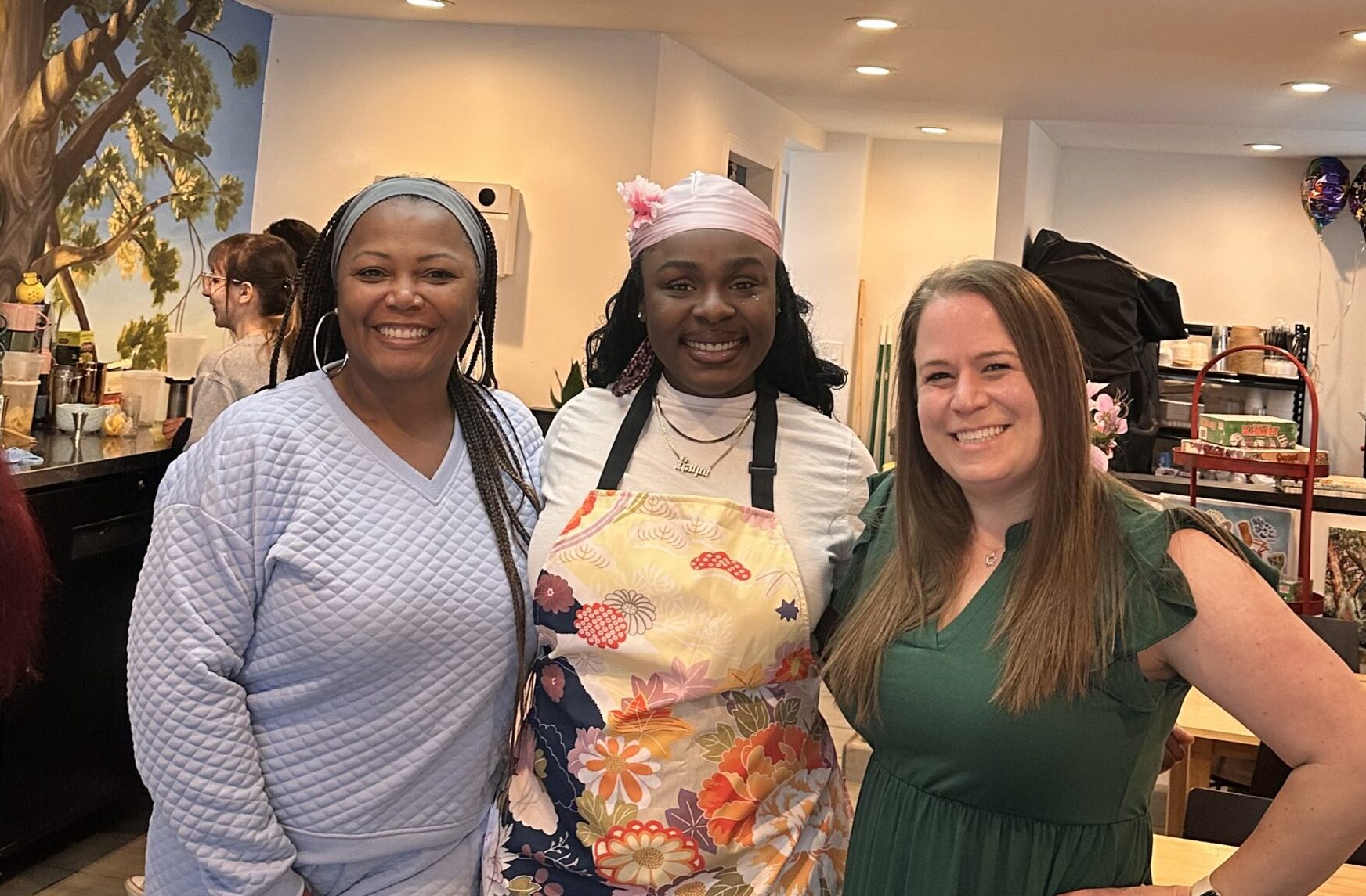 Raquael Hines with Village Council members Summer Jones and Hannah Zollman at the opening of Tiraās Cafe on April 25, 2026.