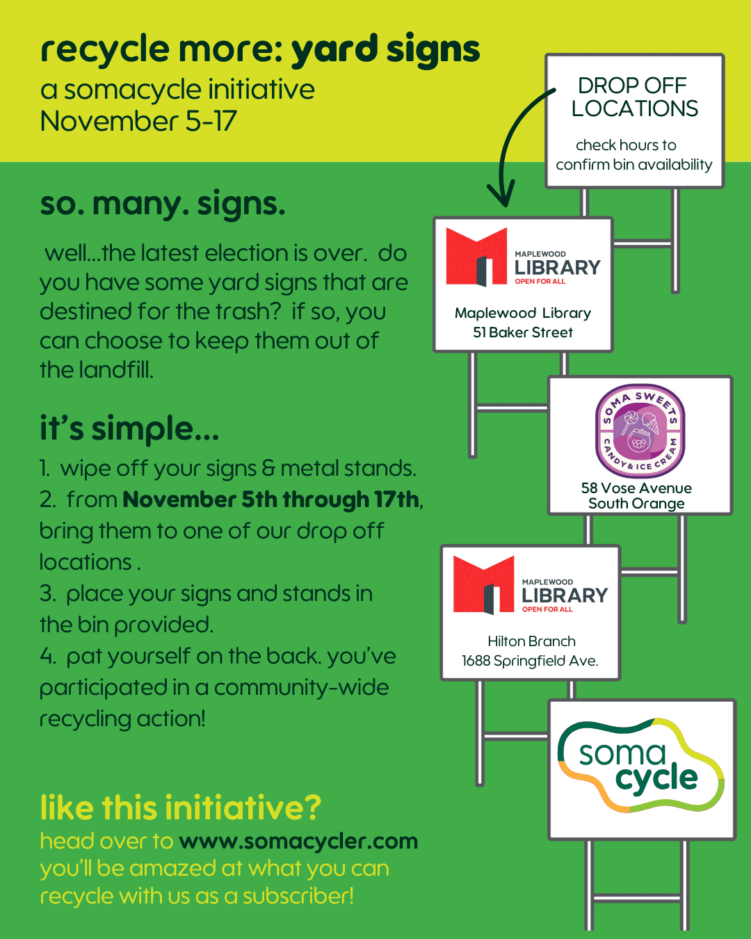 SOMACYCLE is conducting another free, community-wide post-election recycling initiative this week with drop off points in both South Orange and Maplewood.