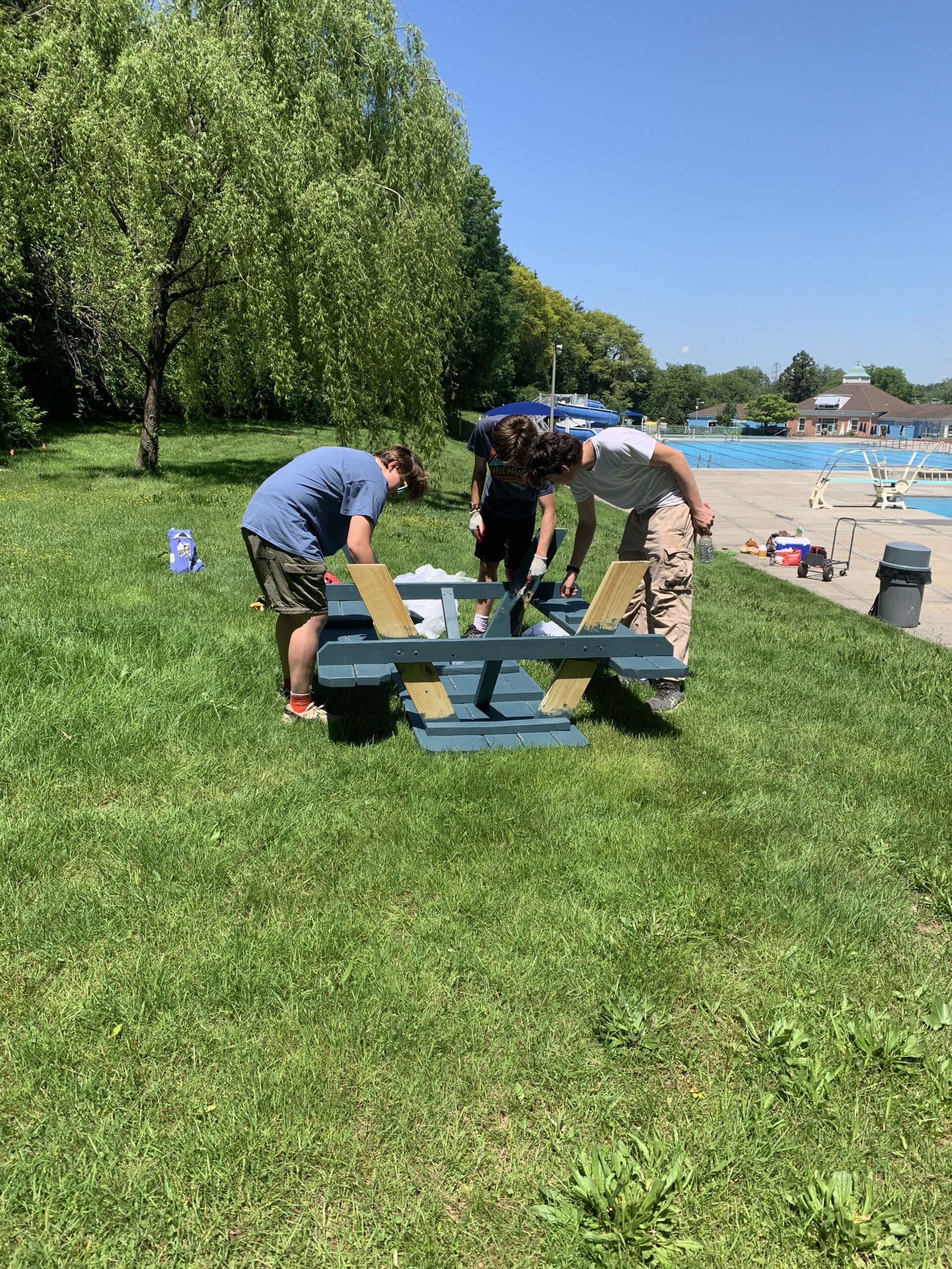 Sam Daley (on right) and volunteers painting a new picnic table at the Maplewood Community Pool.