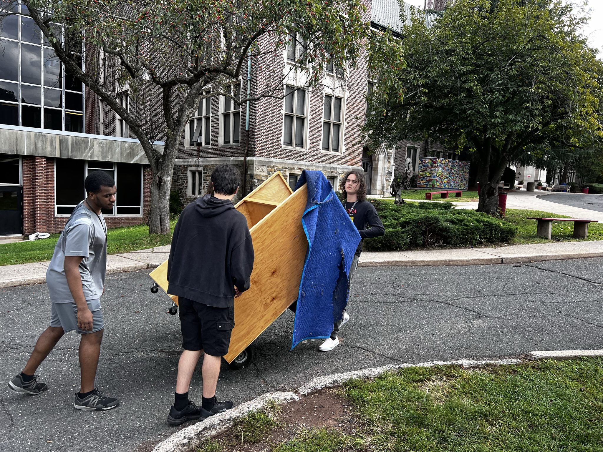 Alexander Lopos (on right) and volunteers delivering new orchestra instrument shelving to Columbia High School.