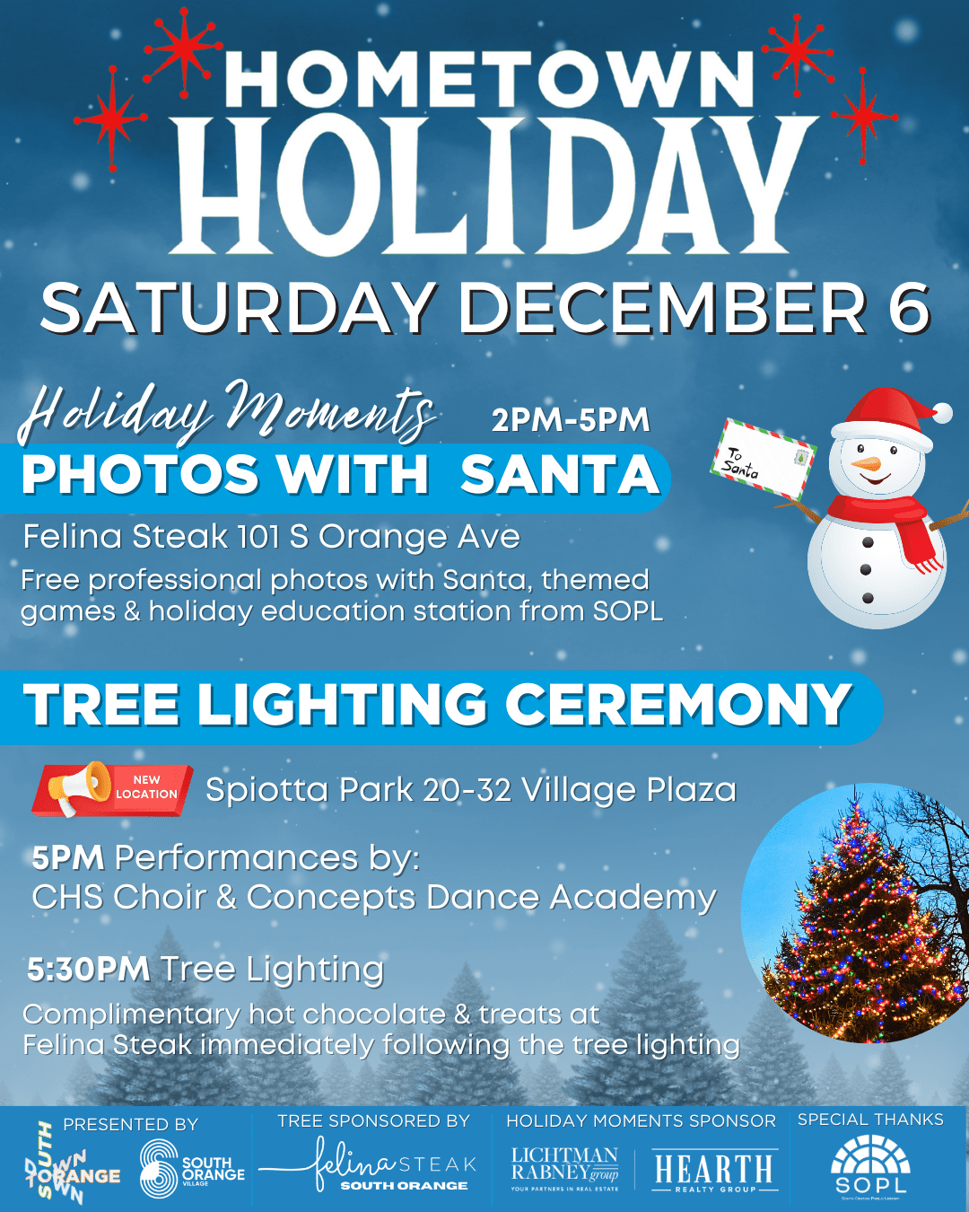 South Orange Downtown extends heartfelt thanks to South Orange Village for its partnership in bringing this event to life. Additional gratitude is extended to the Tree Sponsor, Felina Steak by Landmark, and the Holiday Moments Sponsor, The Lichtman Rabney Group of Hearth Realty, for their generous support.
