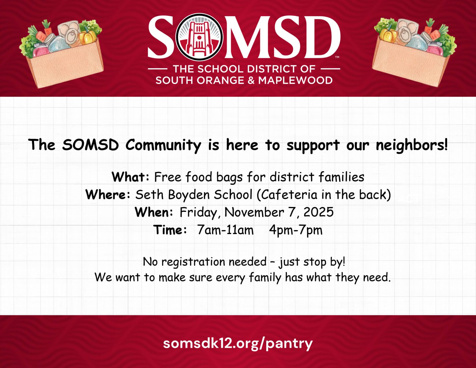 The South Orange-Maplewood School District is conducting food pickups for families this Friday, November 7, to accommodate families experiencing difficulty with food access and/or affected by the disruption in SNAP or Supplemental Nutrition Assistance Program benefits.