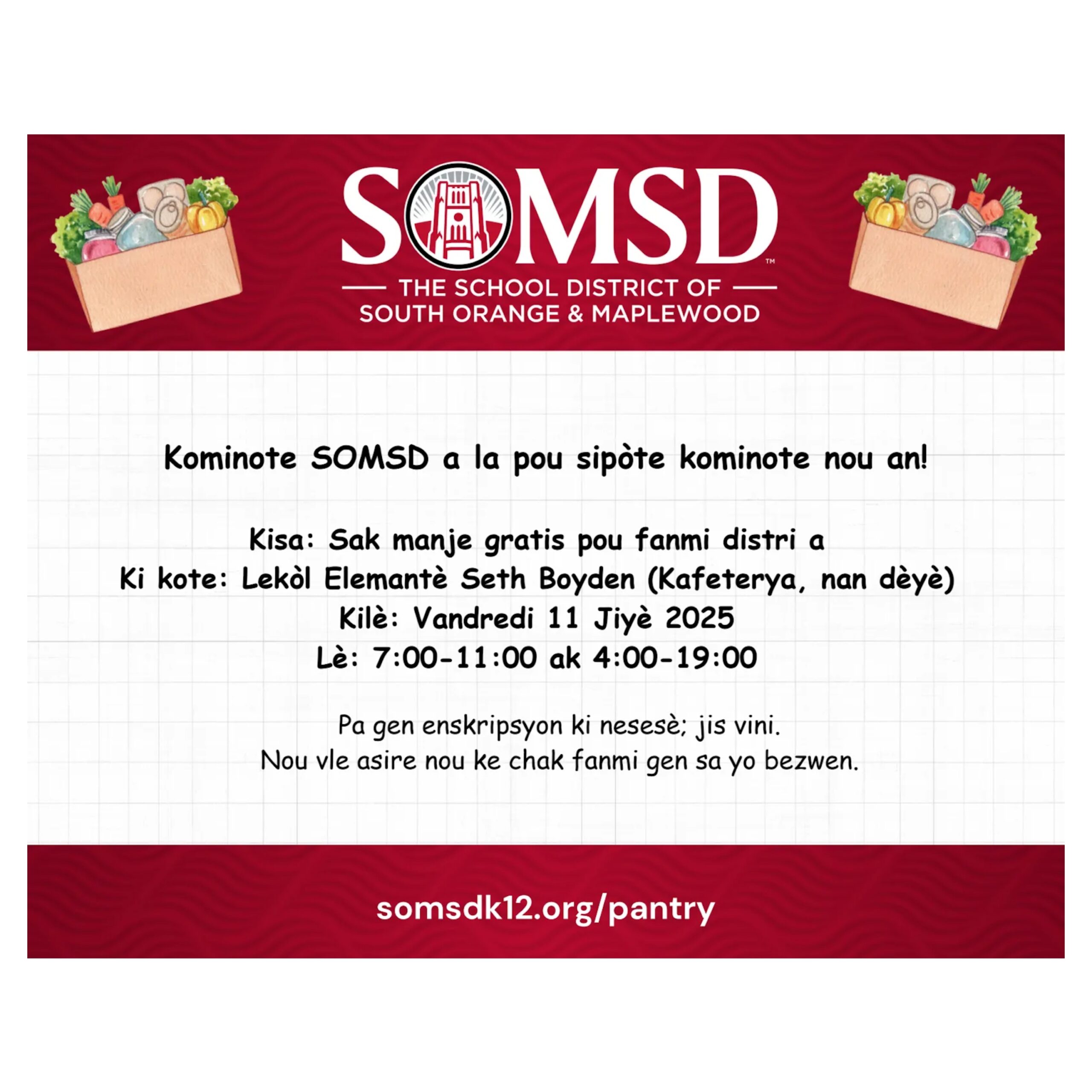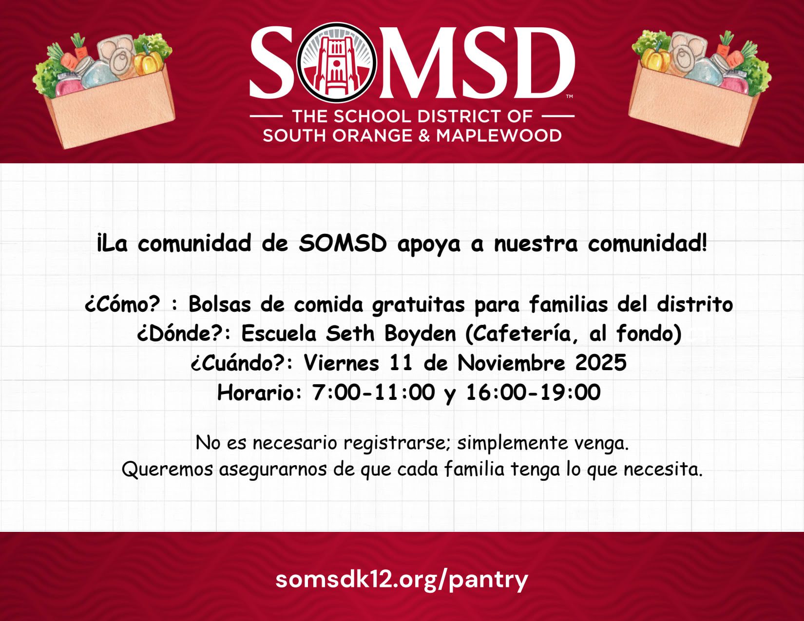 The South Orange-Maplewood School District is conducting food pickups for families this Friday, November 7, to accommodate families experiencing difficulty with food access and/or affected by the disruption in SNAP or Supplemental Nutrition Assistance Program benefits.