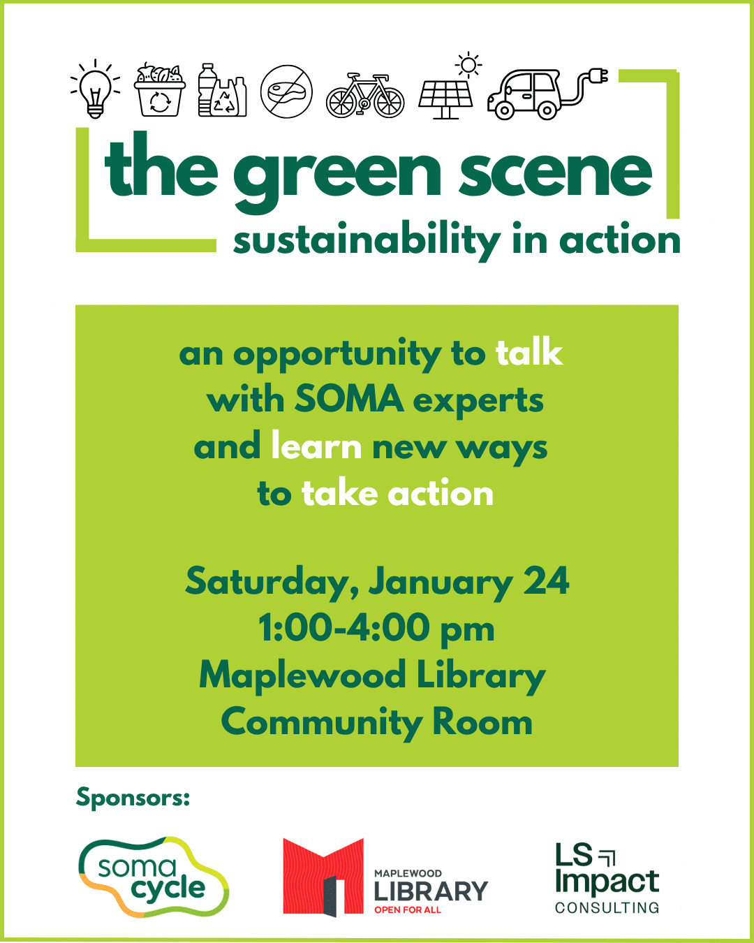 The Green Scene: Sustainability in Action, is co-hosted by SOMACYCLE founder Catherine Redd and LS Impact Consulting’s Lauren Sklaver, in partnership with the library, and will bring together local sustainability-minded businesses, organizations and community groups to provide information to help residents start or increase their sustainability efforts.
