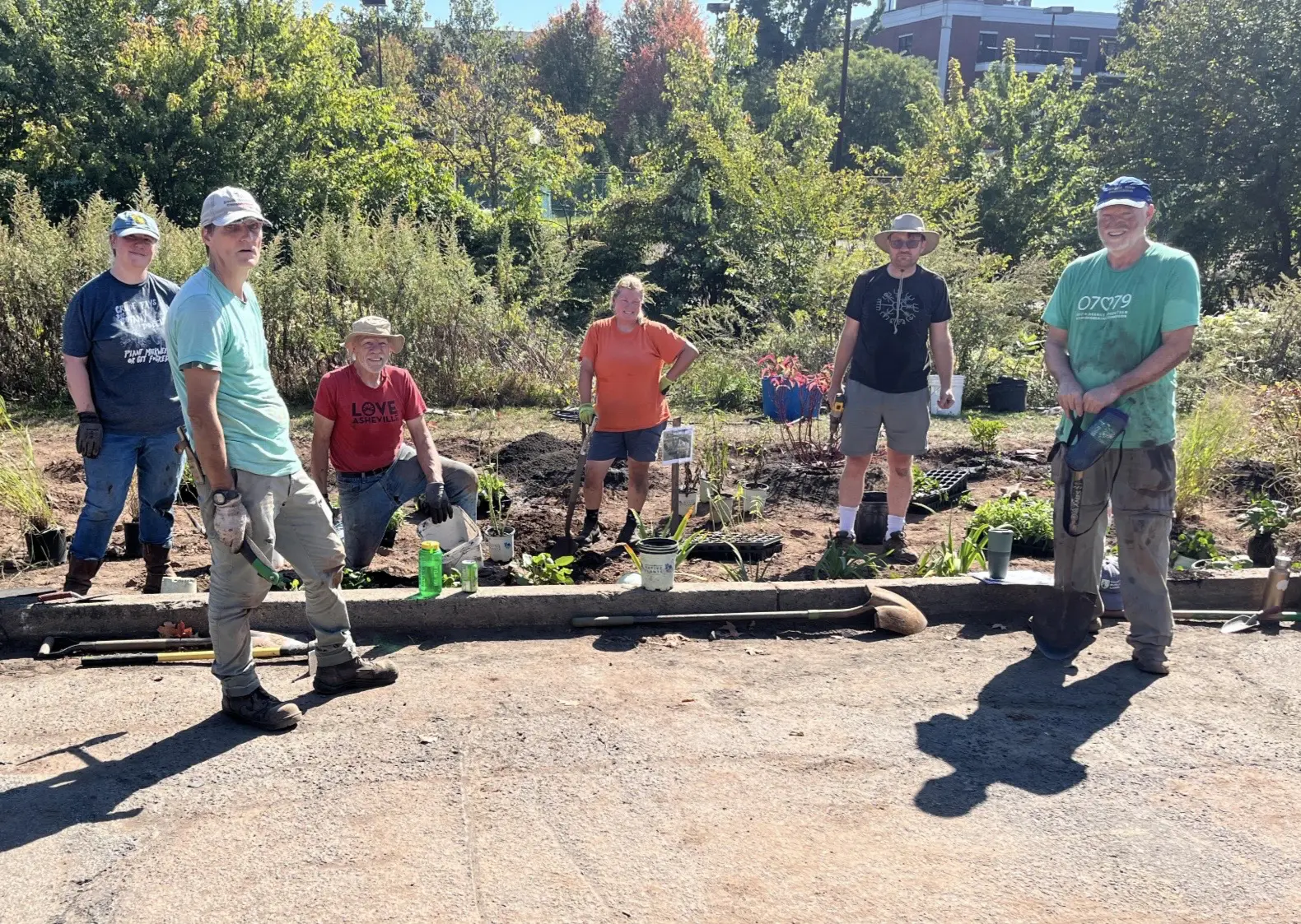 The South Orange Rain Garden planting crew from left: Jessica Miller, Bill Haskins, Chris Black, Elizabeth Payne, Daniel Wright, Kirk Barrett (not shown: Tekla Pontius-Courtney).(Photo by Andy Stone)