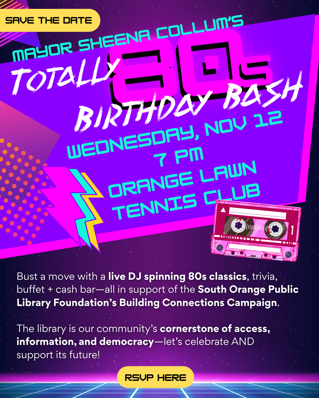 The South Orange Public Library Foundation is bringing the community together for a night of neon, nostalgia, and neighborly giving at Mayor Sheena Collum’s Totally 80s Birthday Bash on Wednesday, November 12, at 7:00 PM at the Orange Lawn Tennis Club.