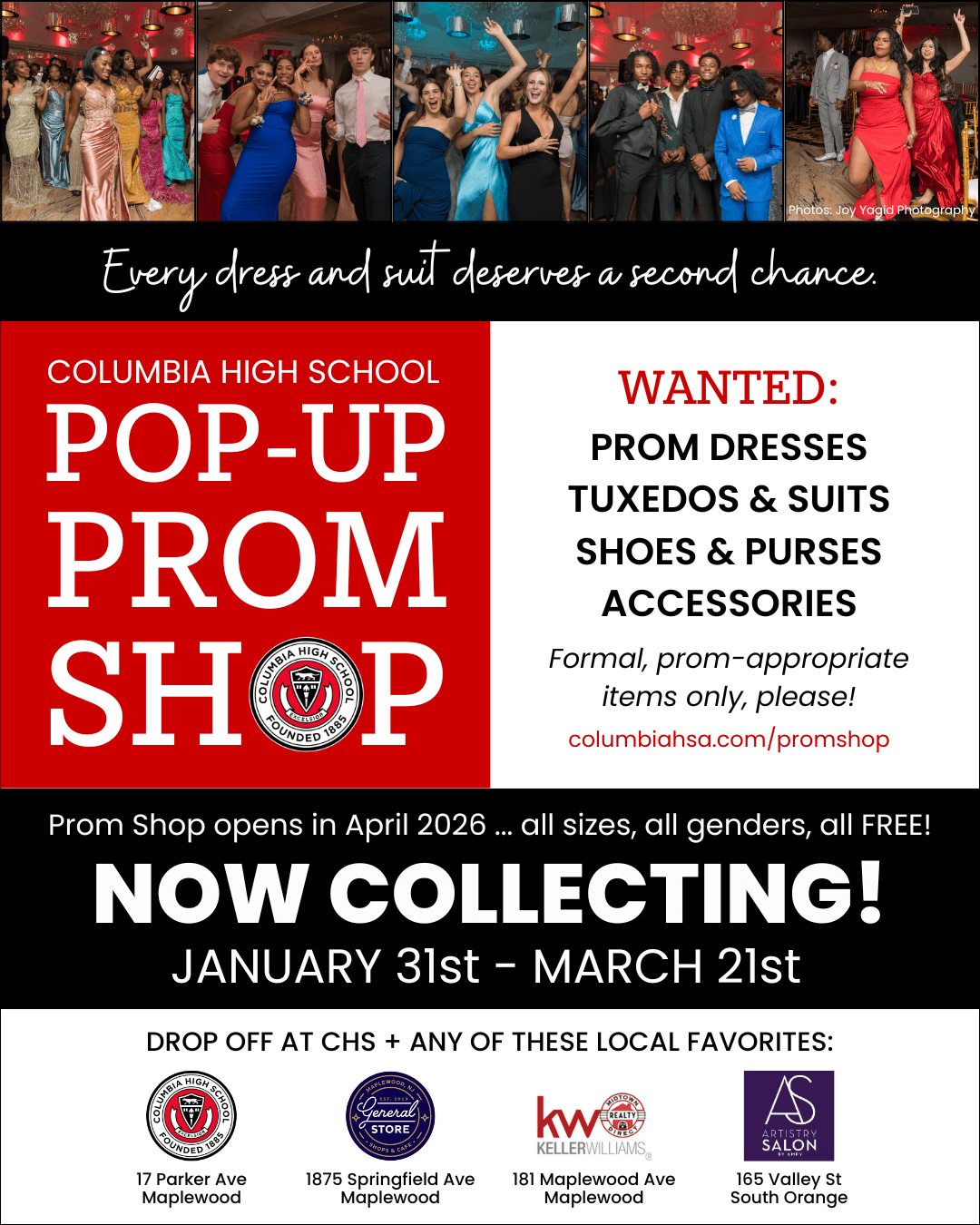 The CHS Home & School Association is collecting teen-approved, prom-appropriate formalwear until Saturday, March 21, 2026, at locations throughout Maplewood and South Orange. CHS Pop-Up Prom Shop opens in April … all sizes, all genders, all FREE!
