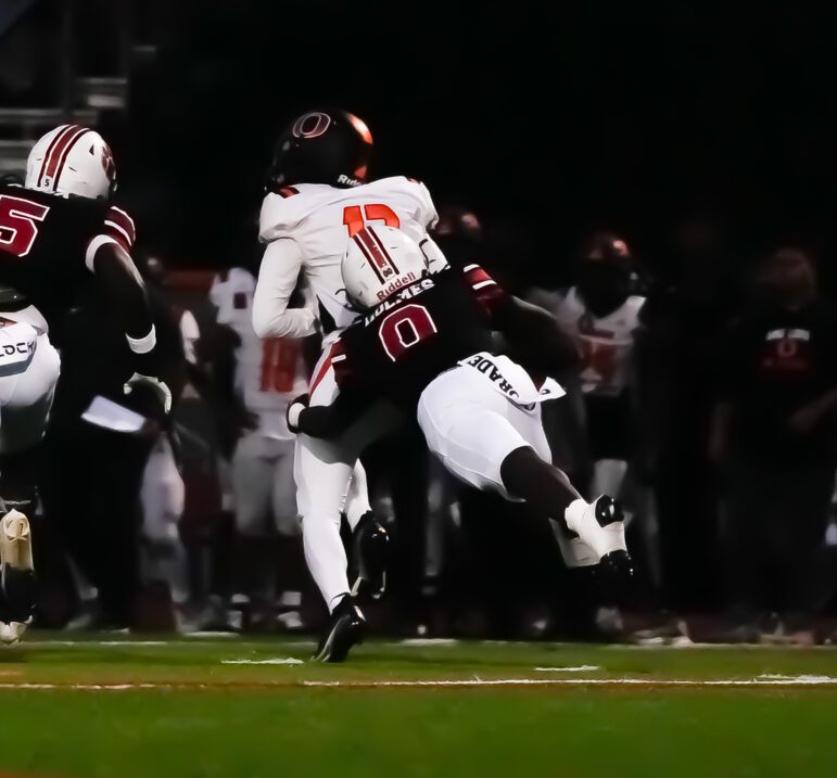Sophomore linebacker Jalen Holmes makes a tackle against Orange High School. (Photo by Daniel Kuhlman)