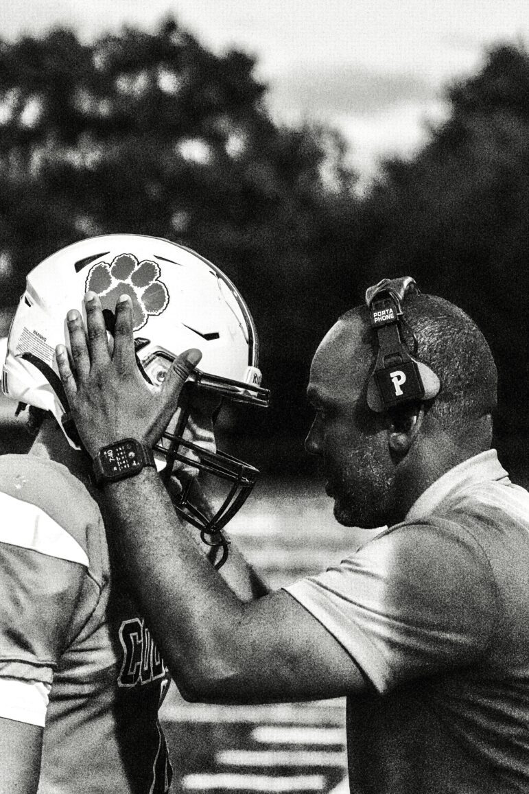 Coach Lys Blanc having a moment with senior running back Jasiel Phair, who leads the team with 669 rushing yards so far this season. (Photo by Daniel Kuhlman)