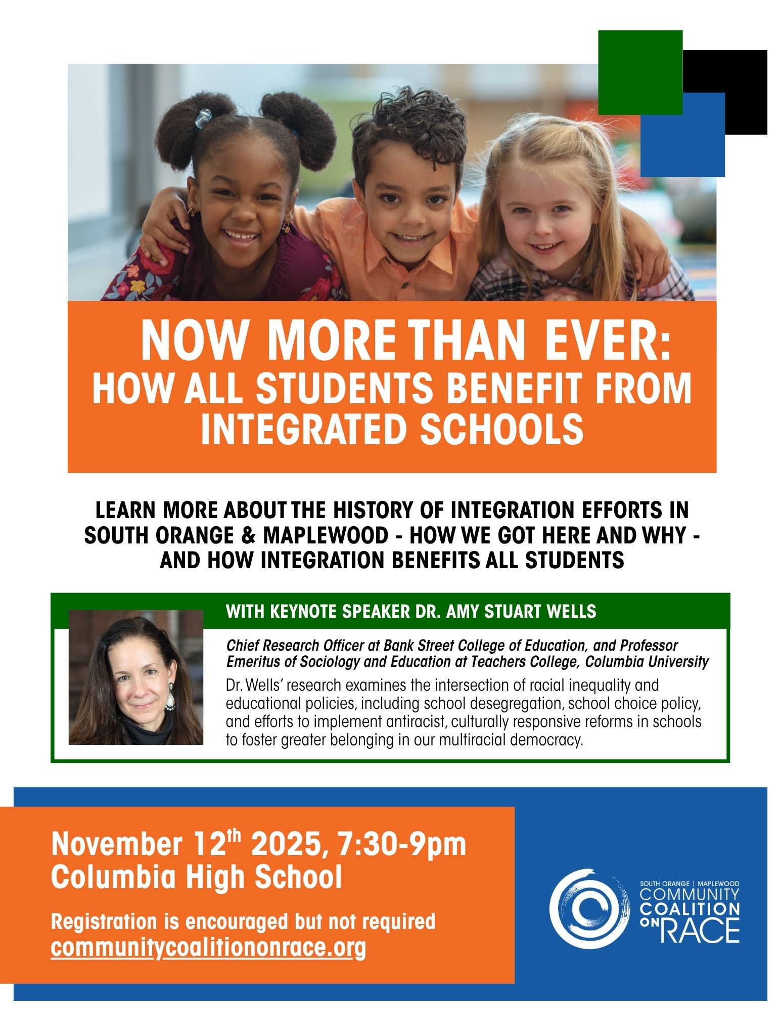 The South Orange/Maplewood Community Coalition on Race invites all to take a post-election look at this important initiative during, “Now More Than Ever: How All Students Benefit from Integrated Schools.” This special event will take place on Wednesday, November 12, in the Columbia High School auditorium from 7:30 to 9:00 p.m. It is free to the public and advance registration here is appreciated but not required.