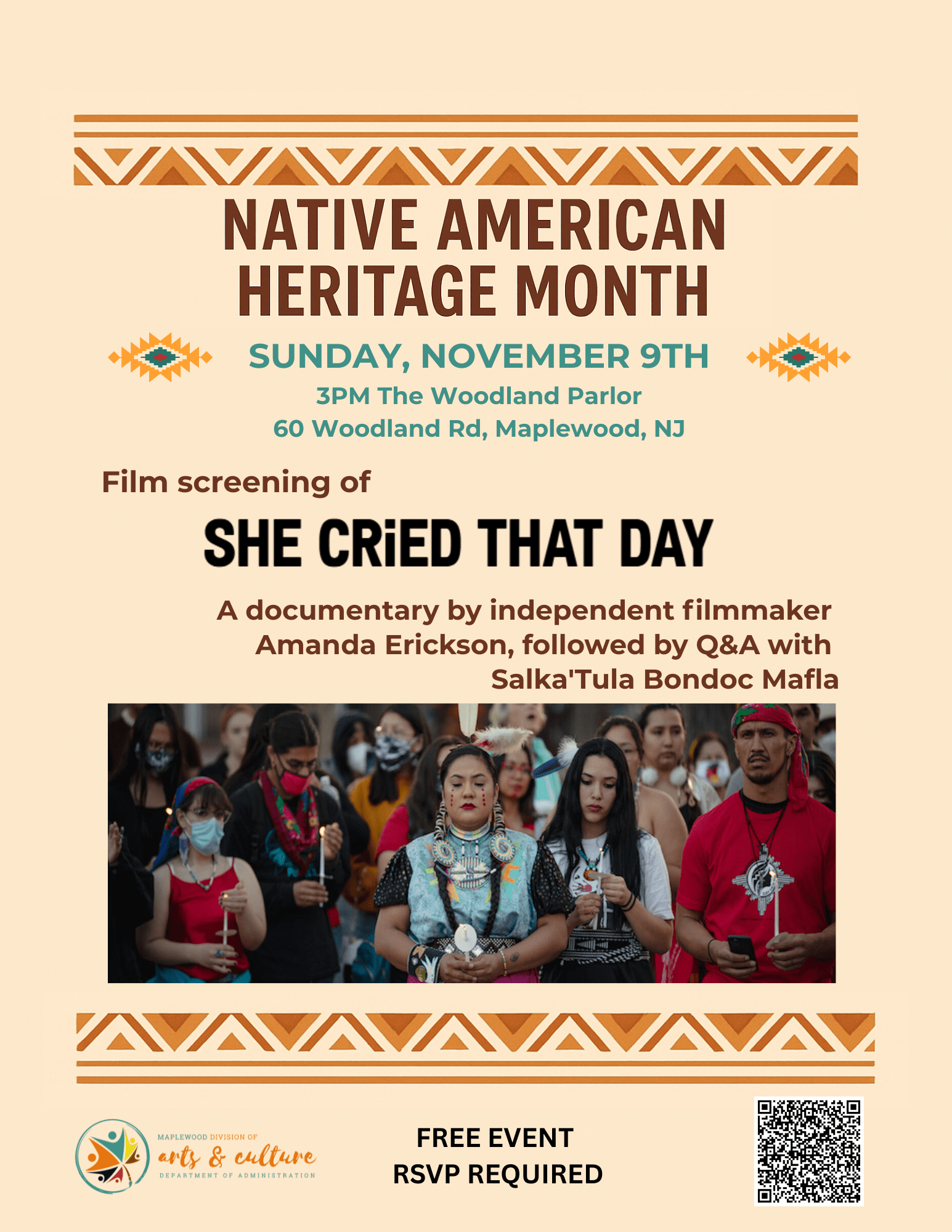 For more information: Celebrating Native American Heritage Month – Film screening: SHE CRiED THAT DAY — Maplewood Arts & Culture Maplewood Division of Arts & Culture Manager, Andrea Teutli, at [email protected] or (973) 843-7157.