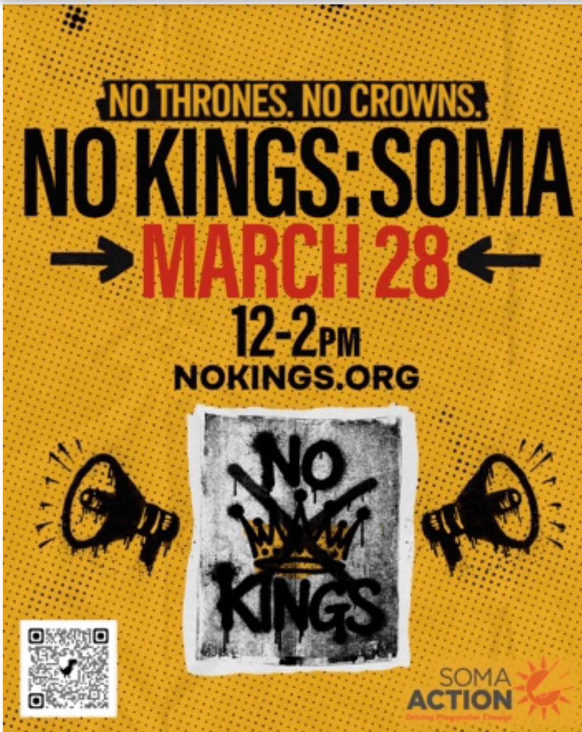 - Register for the March 28 No Kings rally at the official SOMA Action Mobilize page: Location TBD—check back for updates.