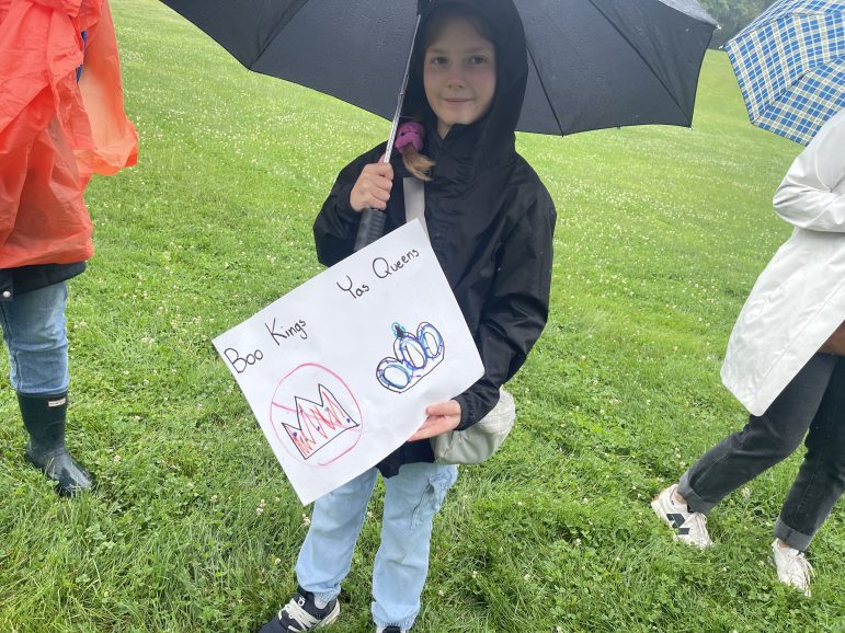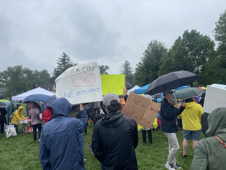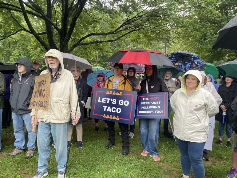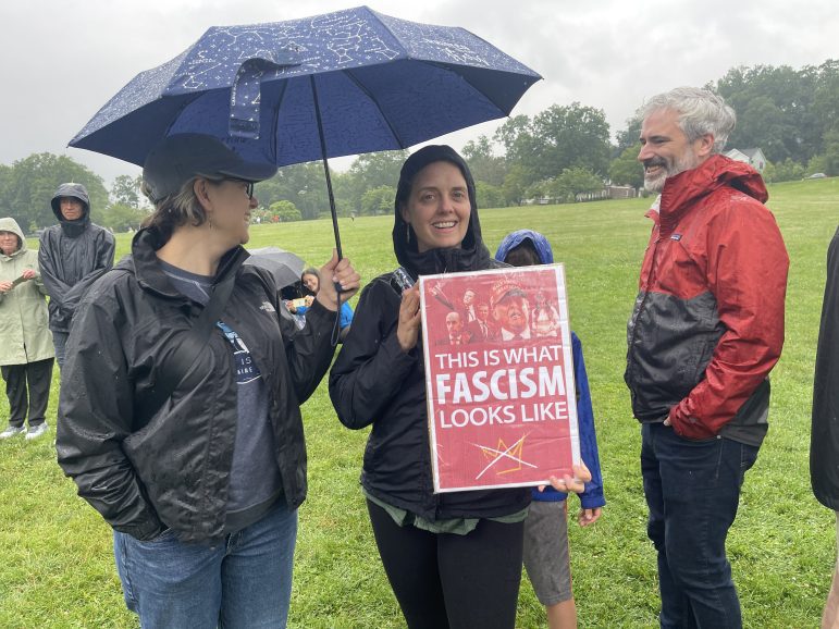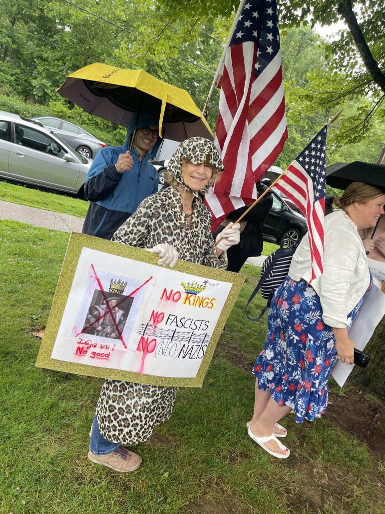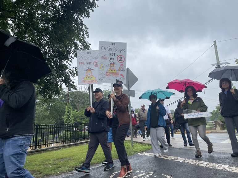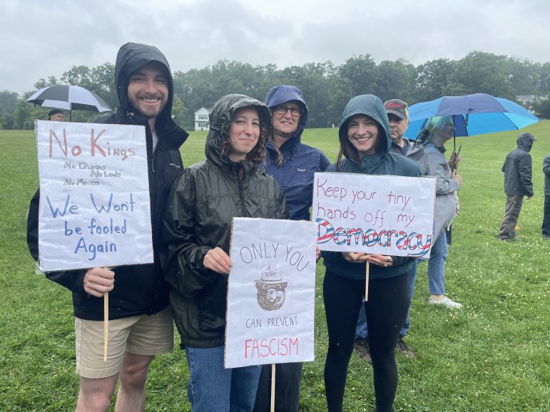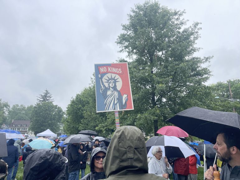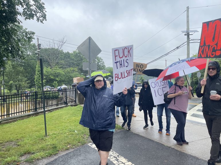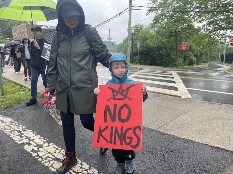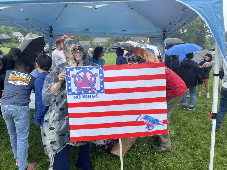 Hundreds gathered in the rain at Flood’s Hill in South Orange to march through Cameron Field and up South Orange Avenue on Saturday, June 14, for the “No Kings” protest against authoritarianism.