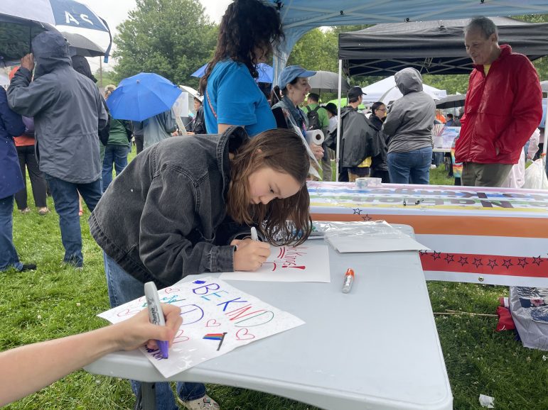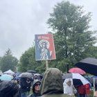 Malinoski said that a small group of pro-Palestinian demonstrators on June 14 “were not with us, they set up their own thing. Our safety marshals successfully deescalated one minor conflict between them and a passersby. We’re very proud of our volunteers who stepped up to help things run smoothly and show that ordinary people can keep each other safe. This is what democracy looks like!”