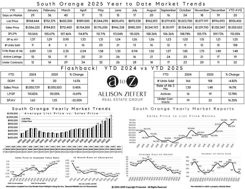 In South Orange, a similar trend emerged. The strongest list-to-sale price ratios also clustered in the spring months, with April and May showing peak performance, averaging roughly 113–115% of list price, before moderating later in the year.