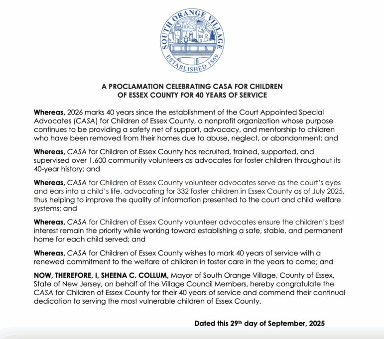 The South Orange Village Council honored Court Appointed Special Advocates for Children of Essex County (CASA Essex) with a proclamation in honor of its 40 years of advocacy on Monday.