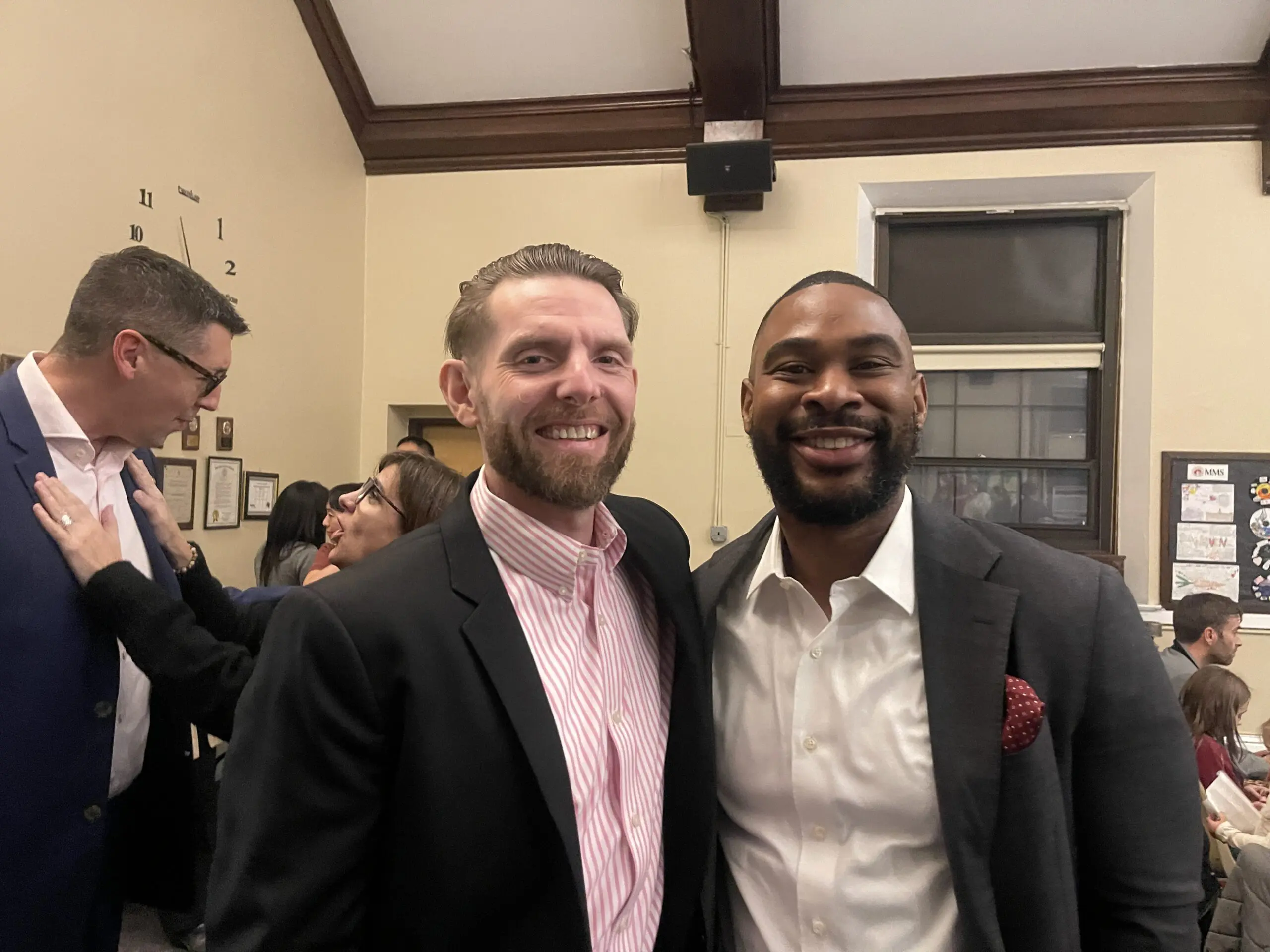 Newly elected New Jersey Assemblyman Chigozie Anyema and outgoing Board of Education member Bill Giffords. (Photo by Mary Barr Mann)